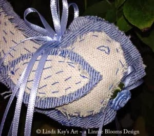 I placed the Linnie Blooms canvas shapes over the denim and cut around them leaving a 1/4″ seam allowance. I did the detail stitches first, then stiched them together just by holding them between my fingers. No glue, no pins. I like the little bit of raw edges here too. I stuffed him gently with a bit of pellon and made a ribbon hanger long enough to go over a branch if I want.