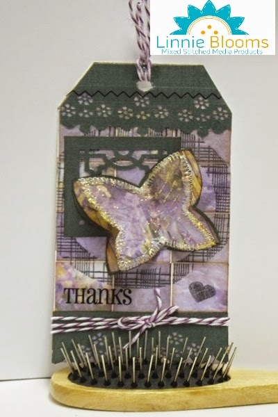On this tag I Kreaxions #903 punched the bottom and top border. I ink stamped the circle behind the butterfly and the stitching and sentiment is SRM stickers. Twine is also applied to this tag.